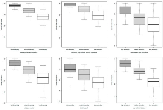 The distribution of the mean scores given by primary users to desirable app content/functionalities/technical features, grouped by the six questionnaire domains (i.e., pregnancy care and counselling, mother and child postnatal care and counselling, reminders and push notifications, notes and records, social support, and app technical features), is shown in Figure 1. Overall, higher scores were obtained for the domains of “pregnancy care and counselling”, “mother and child postnatal care and counselling”, and “app technical features”, as shown by the left-skewed distributions of the (a), (b), and (f) plots.