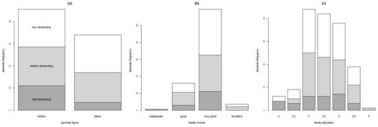 Distribution of primary user clusters, grouped by parental figure (a), family income (b), and family education (c).