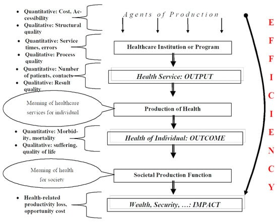This requires determining what the resources and respective results are. Figure 1 shows that resources are the consumption of the agents of production. They can be expressed as cost, accessibility, or components of structural quality. The healthcare institution or program transforms these agents into outputs, e.g., services and result quality. The individual (patient) consumes these outputs and produces their individual health as an outcome. Typical measures for it are morbidity, mortality, or quality of life. Finally, the health of the individual has an impact on the wealth, growth, security, and cohesion of the society. Consequently, any analysis of efficiency and/or value-based health care requires an assessment of the consumption of agents of production (usually expressed in their financial terms as cost) and the results they focus on.
