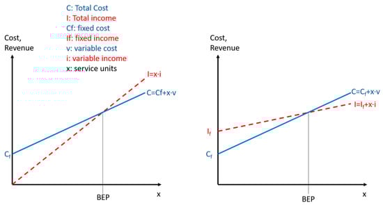 Figure 2 confronts the “normal” and the “flipped” break-even-analysis. Most textbooks [] assume that fixed income is very small while fixed cost is high. At the same time, variable costs are less than variable income. Consequently, the profit zone starts to the right of the break-even point (BEP). In the flipped situation, fixed income is higher than fixed cost and the variable cost is higher than the variable income. Consequently, the loss zone starts to the right of the BEP.