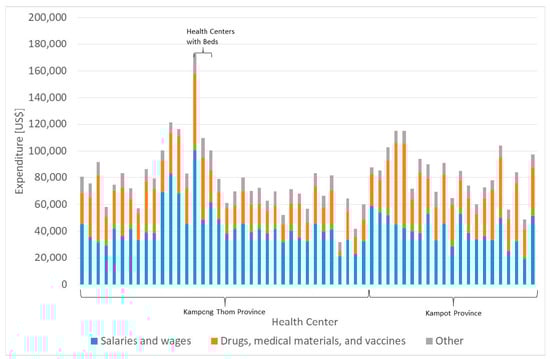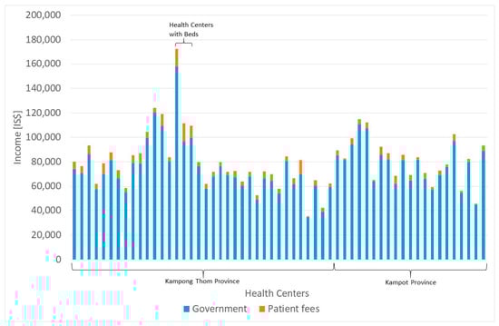 The Royal Government of Cambodia launched a series of healthcare system reforms in the 1990s including the introduction of cost-sharing (i.e., direct patient fees) at facilities and the provision of health services at the national, provincial, district, and health center level []. In 2021, there were 1250 public health centers, 94 district referral hospitals, 25 provincial referral hospitals, and nine national hospitals []. The health center (HC) is the frontline healthcare facility that provides the minimum package activity (MPA). This makes the HC the first contact point for people seeking healthcare. Normally, an HC covers around 8000 to 12,000 people. The HC mainly receives funds, human resources, buildings, equipment, drugs, and other materials directly from the government. Most health centers have a workforce of about 7–10 staff members with a focus on nurses or nurse-midwives. Very few health centers have a medical doctor or medical assistant. A special category exists, called a “health center with beds”, which provides MPA services and additional inpatient services. The number of staff at an HC with beds is usually higher than at health centers without a bed.