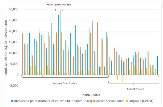 The respective figures for fixed income, variable income per service unit, fixed cost, and variable cost per service unit can be used to calculate the break-even point and compare it with the surplus or deficit of the institutions. On average, a health center makes a small surplus of $1533.01 with an actual number of service units of 12,316. The respective break-even point is calculated as 13,312.75. As Figure 5 shows, the few health centers with a loss are those that produce more service units than the BEP.