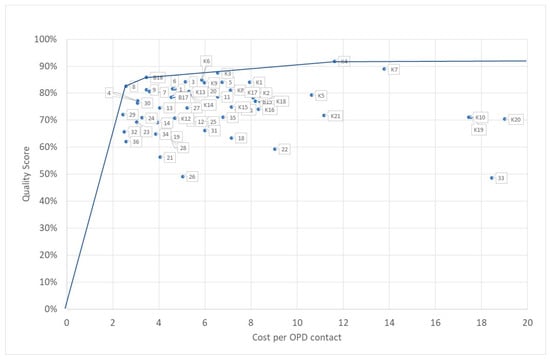 - Efficiency: The efficiency statistic is built on a rather simple index number as the ratio between the quality score and cost per service unit. The number of service units was calculated as the total of service units for all cost centers. This is a simplification as some facilities might show poor efficiency while they are very efficient in one particular service. Other authors have shown that data envelopment analysis (DEA) can overcome this problem [], an alternative could be stochastic frontier analysis (SFA). However, the focus of this paper is on the flipped break-even and the impact on the value-for-customer. It should, however, be respected that this limitation must not lead to an accusation against an individual institution. It should, however, open the platform for further discussion on quality, cost, and efficiency between the government and the leadership of health facilities;