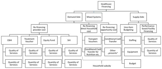 Internationally, many healthcare financing instruments have been developed (Figure 7). It is obvious that supply-side financing does not have to be provided as lump sum payments. The provision of drugs, materials, staff, equipment, buildings, etc., could also depend on the performance of the health facility, which could be measured in quantity (e.g., number of consultations) and/or quality. The latter is more difficult to assess and requires a comprehensive system of structural, procedural, and result-based indicators to measure quality [,]. The quality score, as described in Section 2.4, could be a starting point as an index number to justify and quantify performance-based supply-side facility funding, but many more parameters have to be considered, such as financial and spatial accessibility (equity).