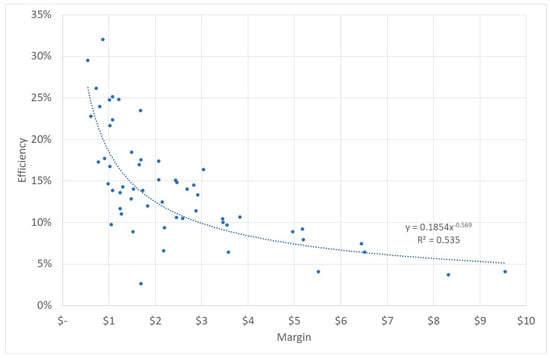 Instead, the margin explains 43% of the variance of the efficiency. A higher margin significantly reduces efficiency. Figure 8 shows the respective data and a best-fit power function (R2 = 0.54). It is obvious that an increasing difference between variable cost and variable income leads to lower efficiency of the facility. In other words, institutions that receive a higher variable income from patients or from the government have a clear incentive to work more efficiently. Consequently, facilities with higher income from direct patient fees, HEFs, vouchers, and the NSSF tend to be more efficient than facilities that are entirely budgeted by the government. At the same time, other studies have proven that direct patient fees induce a risk of inequity and prevent patients from seeking healthcare at all [,]. Our findings, in combination with these studies, call for a higher share of HEF, vouchers, and NSSF funding to increase the efficiency of rural health centers.
