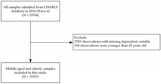 In this study, 19,744 observations were admitted from the CHARLS database in Wave 4. After selection, the remaining 15,767 observations were used in this paper. The specific sample selection process is shown in Figure 1.
