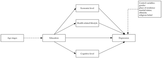 Therefore, this study assessed the association between education and life-course depression in middle-aged and elderly in China. We propose four hypotheses: (1) education can indirectly affect depression in middle-aged and elderly people through economic level, (2) education can indirectly affect depression in middle-aged and elderly people through health-related lifestyle, (3) education can indirectly affect depression in middle-aged and elderly people through cognitive level, and (4) age stage in the life course moderates the effect of education on depression.