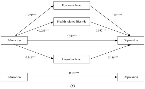This study used the bootstrap method to further analyse the multiple mediating outcomes of education on depression. From Table 6 and Figure 3a, the total, direct and indirect effects of the whole sample were significant, and the cognitive level path accounted for 84.9% of the indirect effect. From Table 6 and Figure 3b, the direct effect of the middle-aged sample was not significant, and the total and indirect effects of the three mediating pathways were all significant; that is, economic level, health-related lifestyle, and cognitive level should produce complete mediation. The cognitive level path accounted for 74.3% of the indirect effect. As shown in Table 6 and Figure 3c, similar to the whole sample, the total, direct, and indirect effects of the elderly were all significant, indicating that in the elderly sample, the three mediating pathways only produced a partial mediating effect. The cognitive level path accounted for 83.9% of the total indirect effect.