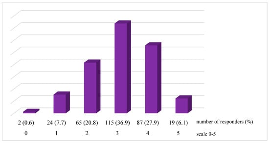 In a 0–5 scale, where the bigger the number, the higher the stress level, majority of respondents (36.9%, n = 115) assessed their stress level as 3, then 27.9% (n = 87) as 4, 20.8% (n = 65) as 2, 7.7% (n = 24) as 1, 6.1% (n = 19) as 5. Only two people (0.6%) chose number 0. (Figure 1). Mean value of the results: 3.0, median value: 3.0, standard deviation: 1.0, 95% CI: 2.9–3.1.