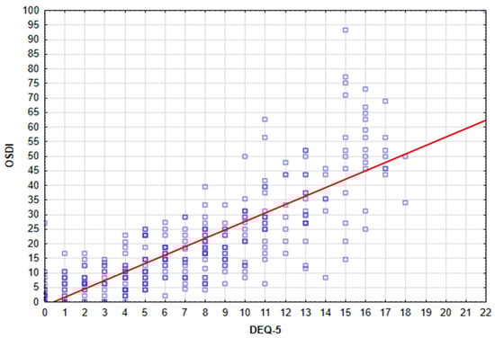 There was a significant correlation between the OSDI and DEQ-5 scores, based on Spearman’s rank correlation coefficient (rho = 0.82, p < 0.001), which means that the overall results of the OSDI are related to dry-eye symptoms measured by DEQ-5 (p < 0.001). It confirms the reliability of the questionnaires used in the study and the credibility of the respondents.