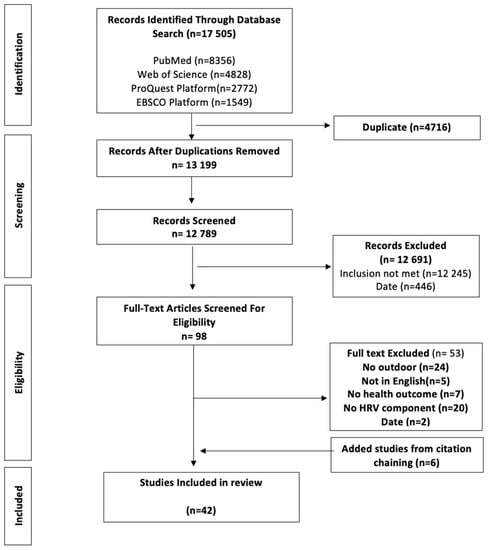 3 | HRV and Outdoors | (((((((((“nature”[MeSH Terms] or “wilderness”[MeSH Terms] or “environment”[MeSH Terms])))) OR (“wild*”)) OR (((“outdoor*” or “out-door” or “out door” or “out-of-doors” or “out of doors”)))) OR (“outside”)) OR (((“green” or “greenspace” or “greenery”)))) OR (((“flora” or “fauna” or “countryside” or “landscape” or “open air” or “hik*” or “camp*” or “backwoods” or “hill*” or “mountain*” or “forest*” or “wood*” or “garden*” or “park*”)))) OR natur*) AND (((HRV or “Heart rate variability” or “HR variability” not “human rhinovirus”) OR (“Heart Rate”[Mesh] and variability) OR (“R-R interval” OR “R-R Variability” OR “RR interval” OR “RR Variability”))) |