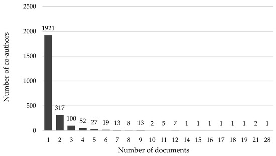 A total of 2493 co-authors, who had published between 1 and 28 papers, were found. Most of the co-authors had published 1 or 2 papers (2238 co-authors, 90%), with only 1% having published 10 or more (11 co-authors). Figure 2 shows the distribution of co-authors according to the number of published manuscripts.