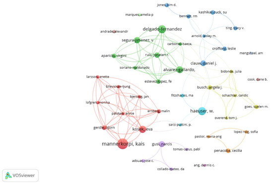 After applying Lotka’s law, it was estimated that the most prolific co-authors should be, at most, the 49 co-authors with the highest number of papers (square root of 2493). With 57 co-authors with 7 or more papers and 44 co-authors with 8 or more papers, these latter were considered to be the most prolific co-authors. As the 44 most prolific co-authors had 58 or more citations by applying the h-index, they were also considered the most prominent. Kaisa Mannerkorpi (University of Gothenburg, Sweden) was the most prolific co-author, with 28 documents; followed by Winfried Häuser (Technical University of Munich, Germany) and Manuel Delgado-Fernández (University of Granada, Spain), each with 21 documents; Eva Kosek (Karolinska Institutet, Sweden), with 19; and Inmaculada Álvarez-Gallardo (University of Cadiz, Spain), with 18 publications. Figure 3 shows the 44 most prolific co-authors according to the number of publications and their relationships according to their publications (analysis: association strength; attraction: 8; repulsion: −2; node size: documents; color: cluster).