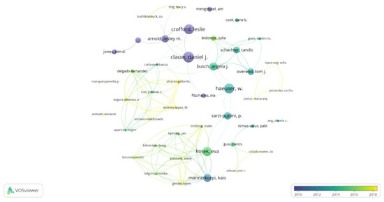 Among the 44 most prolific co-authors, Daniel Clauw (University of Michigan, USA) was the most cited co-author, accumulating 2147 citations; the second author was Leslie Crofford (Vanderbilt University, USA), with 1871 citations; the third was Wilfred Häeuser, with 1852 citations; then Eva Kosek, with 1638 citations; and last, Ernest Choy (Cardiff University, Walles), with 1369 citations. Figure 4 shows the 44 most prolific co-authors according to their number of citations and average year of publication (analysis: association strength; attraction: 8; repulsion: −2; node size: citations; color: average publication year).