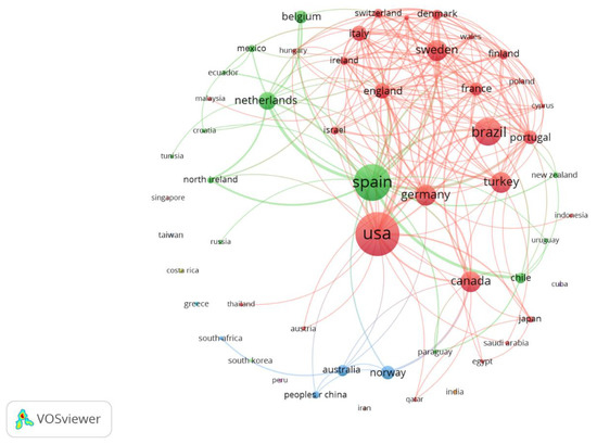 The USA was the country with the highest number of documents (211) and citations (10,132). Spain was the second most productive (143 documents) but the fourth most cited (2617 citations). According to the number of citations, the second most productive country was Sweden (3070 citations, in 46 documents). Brazil (85 documents and 1326 citations), Turkey (49 documents and 1826 citations), and Germany (48 documents and 2432 citations) completed the top 5 most productive countries. In terms of the number of citations, Canada (2923 citations and 46 documents), in third place, and England (2556 citations and 26 documents) completed the top 5 countries.