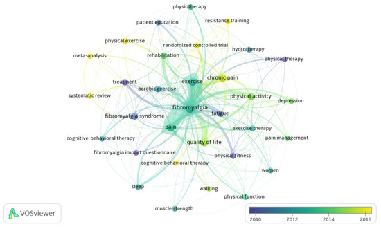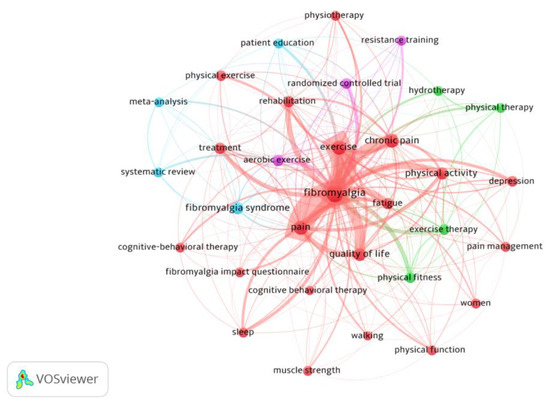 After applying Zipf’s law, 32 keywords with 9 or more occurrences were highlighted. Four clusters were identified within the most frequently used keywords (Figure 7; analysis: association strength; attraction: 4; repulsion: −2). The cluster with the most keywords had FM, their symptomatology and affected dimensions (pain, fatigue, chronic pain, depression, quality of life, or sleep) as a central theme as well as central search terms (exercise or physical activity), among others (red cluster). The other clusters had themes related to interventions such as hydrotherapy, physical therapy, exercise therapy (green cluster), research methodologies in fibromyalgia: a meta-analysis and systematic review (blue cluster), and aerobic and resistance training (pink cluster).