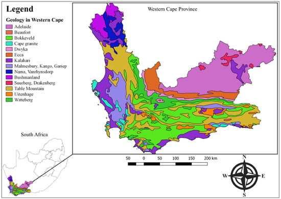In this study, we compare the measured indoor radon and predicted indoor radon concentrations. A further aim of the study is to develop strategies to access radon concentrations in homes and schools. A big part of this study was conducted in the Cape Flats and Stellenbosch areas located in the Western Cape Province, South Africa, as shown in Figure 1. The underlying geology of the Cape Flats and the surrounding areas comprises the Cape Granite Suite, Kalahari Sand, Malmesbury Shale, and Table Mountain Sandstone, as indicated in Figure 1 (Council for Geoscience, downloaded from https://maps.www.geoscience.org.za) accessed on 1 August 2020.