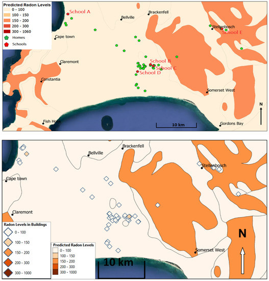 Western Cape map showing the measurement location and measured and predicted indoor radon levels using Bezuidenhout’s model [12].