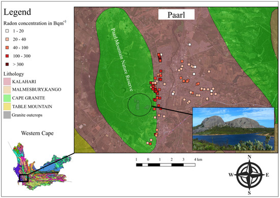 - Lindsay, R.; Newman, R.T.; Speelman, W.J. A study of airborne radon levels in Paarl houses (South Africa) and associated source terms, using electret ion chambers and gamma-ray spectrometry. Appl. Radiat. Isot. 2008, 66, 1611–1614. [Google Scholar] [CrossRef] [PubMed]