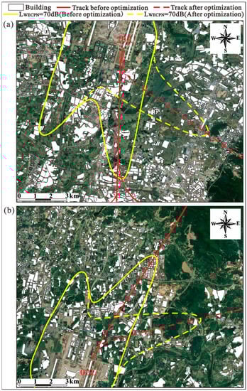 - Summer: Change the flight procedures of T-20R-A, T-20R-B and T-20R-C (refer to Section 2.3 in Lee et al. [27] for the details of flight procedure) of runway 20R to “after taking off from runway 20R, turn left at 71° (turning radius = 2.0 km), then fly straightly......”, as shown in Figure 8a.