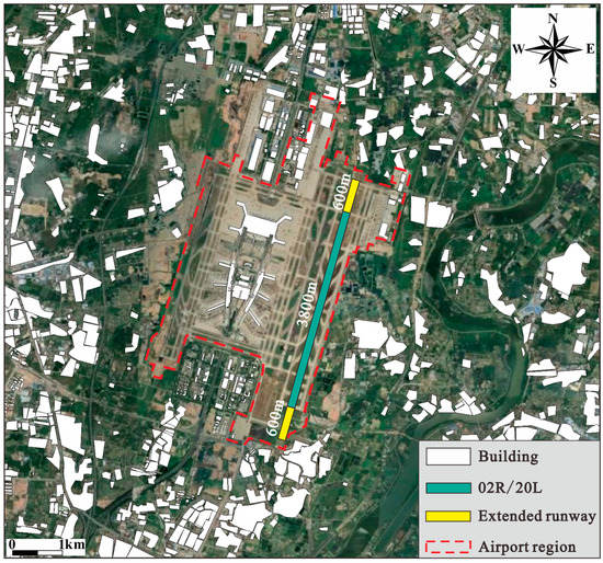 - It is assumed that runway 20L/02R (3800 m) can be extended in both south and north directions by 600 m, by which the extended runway is still located within the airport region, as shown in Figure 9;