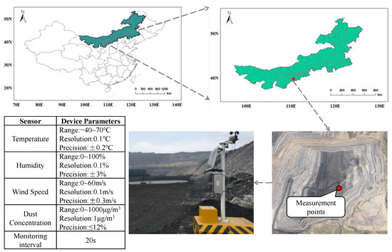 The Haerwusu open-pit coal mine in northwest China was chosen as the research location. The mine is located in a semi-arid region, belonging to a continental semi-dry climate, with low precipitation and high evaporation, requiring frequent watering of the haul roads. Figure 1 depicts the mining area, the location of the measuring points, and the parameters of the measuring device. The measuring equipment monitored PM2.5, PM10, TSP, temperature, humidity, wind speed, and atmospheric pressure every 20 s.