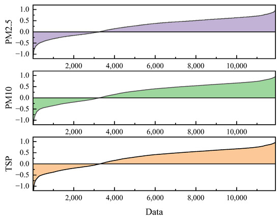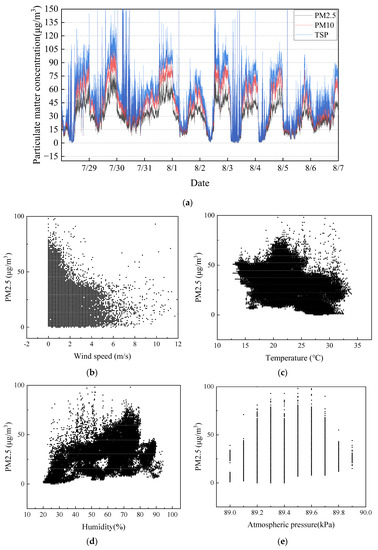 To ensure the statistical significance of the statistical results, a total of 41,381 sets of measured data were selected for this investigation over a ten-day period from 28 July to 7 August 2020. The weather was dry and hot during this period, with no rain. From the curves of PM2.5, PM10, and TSP over time, shown in Figure 2a, we can see that the changes in the three curves are basically the same and have a strong correlation. To observe the correlation between the data, PM2.5 and other characteristic variables were plotted in a scatter plot, as shown in Figure 2b. The scattering points between different characteristic variables and the dust concentration are more aggregated. The data has relatively few discrete data and shows a high correlation. The trend indicates that the data quality is sufficient to be used in machine learning.