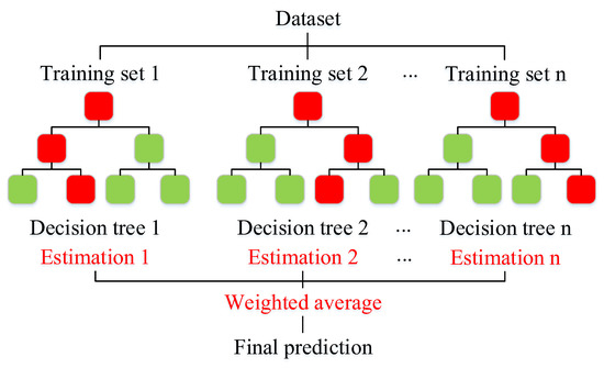 The RF algorithm, an effective machine learning prediction tool, was chosen to develop a model for dust concentration estimation. It is a non-parametric classification or regression technique belonging to a family of supervised machine learning techniques incorporating multiple decision trees to obtain the desired response [23]. The decision tree is a tree-structured decision algorithm where each leaf node represents a decision condition, and each branch represents a decision outcome. RF outperforms classical intelligence algorithms in terms of prediction accuracy and tolerance to outliers and noise [24]. Therefore, the reason for its selection is that the RF has a high noise tolerance. It can effectively find the optimal division of features on N random subsets of decision trees through weighted voting to address the shortcomings of decision trees, which are sensitive to individual data and overfit some datasets. Figure 3 illustrates the general architecture of an RF model.