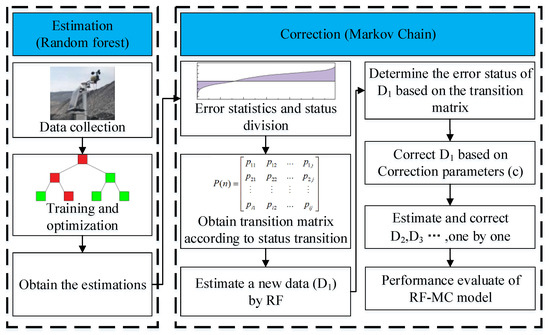 The Markov chain with stationary distribution (described above) implies that the transition probabilities are independent of the time, which means that the transition probabilities of past estimation errors are theoretically the same as the transition probabilities of the present estimation errors [28]. The statistics of past estimation errors can be used as a basis for judging the errors of the new estimates [29]. In this study, the method of using RF for estimation and then using a Markov chain to estimate the error range and correct the estimation results is known as the random forest-Markov chain (RF-MC) model. The RF-MC model is applied along the following logical lines.