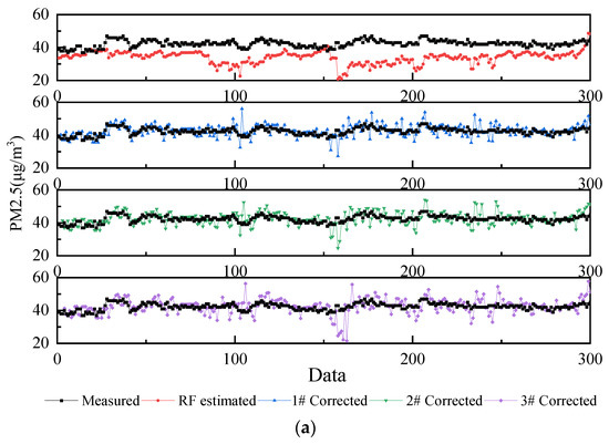 Although the corrected R is still not good enough, the performance of RMSE and MAE is more important for field applications. The 1st level limits of the daily average for PM2.5, PM10, and TSP required in China are 0–35, 0–50, and 0–120, respectively, while the RMSE and MAE for TSP are only 6.27 and 4.28. The accuracy of the estimates in this study will not cause a large bias in determining dust concentrations in the field. Similar conclusions were drawn for PM2.5 and PM10. In addition, it can also be found that the larger the dust particle size, the worse the estimation. Future research on PM10 and TSP may need to consider more features or different approaches in order to further improve the estimation effect. Overall, Markov chains can simply and significantly improve the estimation accuracy of random forest models with poor accuracy to a level that can be applied in the field.