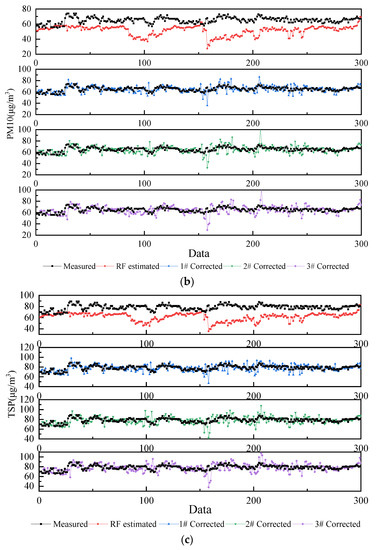 Comparison of curves before and after correction: (a) comparison curve of PM2.5; (b) comparison curve of PM10; (c) comparison curve of TSP.