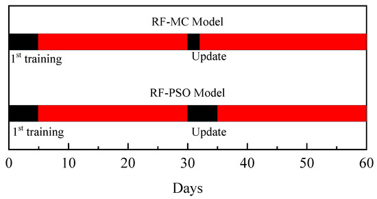 The essence of the RF-PSO model is that RF updates the model, while PSO improves the speed with which the RF model is updated. Due to the excellent correction effect of the MC model, the RF-MC model update is mainly an update of the MC model. The RF model update frequency can be very low as long as the estimation accuracy after MC correction can meet the field requirements. At the same time, MC model updates are statistically more easily and quickly performed than those for the RF-PSO model, and they also have the potential for automation. This makes learning and maintaining estimation models easier for open-pit mine managers. A schematic comparison of the two models is shown in Figure 8, where a specific update interval is assumed for the model.
