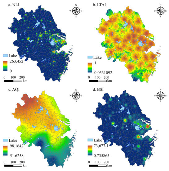 | Nighttime lighting data | Raster | 2020 | Nighttime lighting data with 500 m spatial resolution (NPPVIIRS) | http://www.noaa.gov/web.html, accessed on 10 September 2022. | NLI |