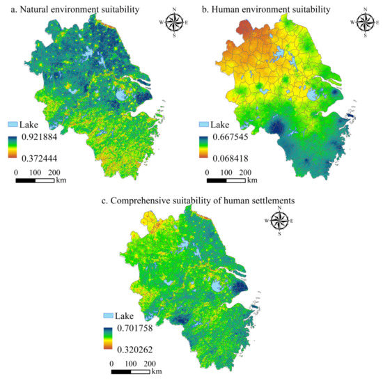 - Song, F.; Yang, X.; Wu, F. Suitable Pattern of the Natural Environment of Human Settlements in the Lower Reaches of the Yangtze River. Atmosphere 2019, 10, 200. [Google Scholar] [CrossRef]