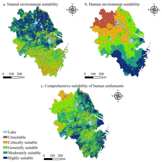 - Yi, W.; Cheng, J.; Lu, M.; Lu, Y. Assessing the suitability of regional human settlements environment from a different preferences perspective: A case study of Zhejiang Province, China. Habitat Int. 2017, 70, 1–12. [Google Scholar] [CrossRef]