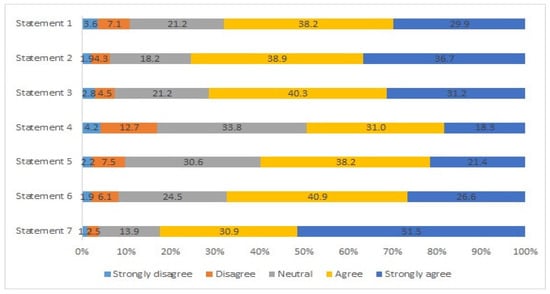 Consumers’ attention to companies’ green marketing communication. Source: Authors’ own elaboration. Note: See Table A1, in Appendix A. Statements: 1: I tend to pay attention to advertising messages that talk about environmental protection; 2: I appreciate brands/companies that have environmental certifications and labels; 3: I respond favourably to brands that use messages about environmental protection in their advertising; 4: I pay close attention to product labels and tags with all the information about their environmental impacts; 5: When purchasing, I prefer products from companies that adopt a responsible attitude towards the environment, to the detriment of others; 6: I support ways of promoting products through environmentally friendly instruments; 7: I consider it important that companies provide/disclose more information about the environmental characteristics of their products and production methods.