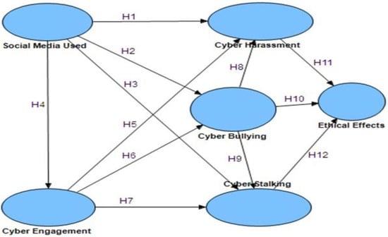 When a person engages in online communication and sharing of thoughts, images, or language directed at a specific individual via electronic mail or electronic communication, causing that person substantial emotional suffering for no legitimate reason, this is known as cyber engagement [39]. Cyber engagement is described as using email or other kinds of online communication to contact a specific someone for no legitimate purpose, sharing texts, images, or media, and causing that person substantial emotional distress [39]. However, as previously said, cyber participation can directly or indirectly alter the ethical ramifications of activity via behavior intention [50]. Aggressive teens are also more likely to indulge in cyberbullying. The ethical implications of conduct are examined from a variety of perspectives in the research literature. In addition, the study’s findings on the relationship between internet use and ethical conduct are quite constant. According to [10], they discovered that the ethical effects of behavior and cyber engagement beliefs explain a significant portion of intention formation across behavioral domains in adolescents [51], including aggressive acts such as peer cyberstalking, cyberbullying, and cyber harassment and abuse [51,52]. On the other hand, the relationship between internet use and ethical conduct is not well recognized. The following theories were offered based on the previous discussion: