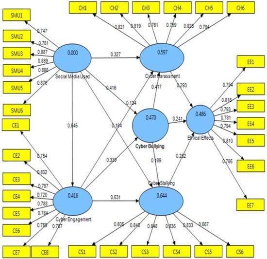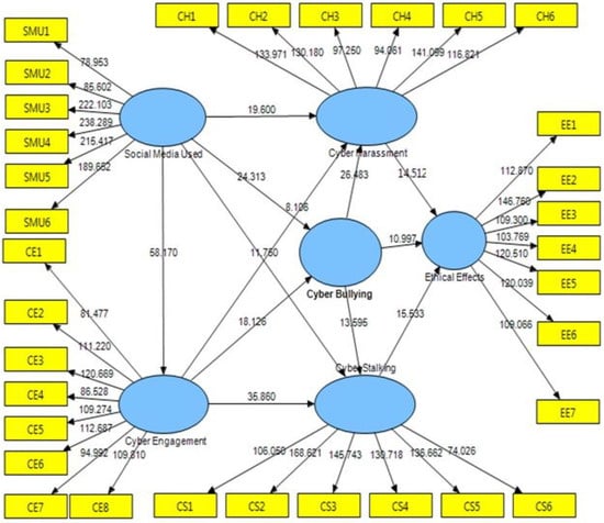The Smart PLS 3.0, a PLS technique implementation, was utilized to test the hypotheses of this study and investigate the correlations between the various variables. Figure 1 depicts the identified route coefficients, whereas Figure 2 and Figure 3 depict the hypothesis testing findings. Table 3 also displays the many types of cyberbullying, stalking, harassment, engagement, and digital media in a wide sense, based on ethical implications of behavior that directly impacts students’ psychological health.