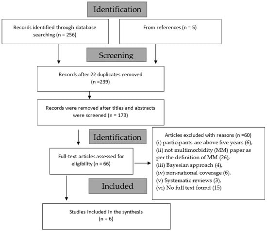 A total of 261 articles were identified from all the electronic databases consulted (MEDLINE(Ovid) = 12, CINAHL = 43, PUBMED= 124, Scopus = 27, Web of Science (WOS) = 50, other sources (from references) = 5), out of which 22 duplicates were removed (see Figure 1). Further, 173 were removed after the abstracts and titles were read for eligibility. Out of the 66 articles selected for full-text reading, an additional 60 were removed for various reasons (including (i) participants are above five years (6), (ii) not multimorbidity (MM) paper as per the definition of MM (26), (iii) Bayesian approach (4), (iv) non-national coverage (6), (v) Systematic reviews (3), and (vi) No full text found (15)). Therefore, data from a sample of six articles were finally extracted and reported in this study.