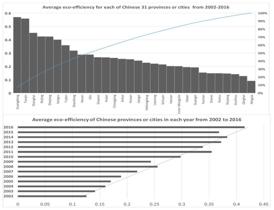 Considering the data availability of and lack of data on Tibet, Hong Kong, Macao, and Taiwan, in the empirical Section 3, all provinces or cities in China were taken into account. The time period is from 2002 to 2016. This paper adopted “SBM (Slacks-Based Measure)” [59] and DEA-SOLVER Pro 5.0 [60] to measure the REEs. The descriptive statistics of the main variables to calculate the REEs are listed in Table S1 and Figure 1. The results are consistent with most other studies [61]. The eastern values of REE are higher than the western values. The value of the eco-efficiency of the whole nation is up to 0.51 in 2016.