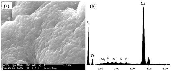 The adhesion of the bacteria to the alginate beads was verified by observation under a scanning electron microscope (SEM at 5000×), complemented by an energy-dispersive X-ray spectroscopy (EDS) analysis (XL-30 ESEM, Philips; North Billerica, MA, USA). First, virgin alginate beads were analyzed; the results are shown in Figure 1.