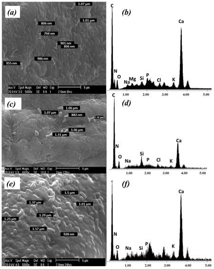 The presence of P. koreensis on the surface of the beads was confirmed by EDS analysis. The characteristic elements of the microorganisms’ prokaryotic wall (P, N, K) were identified in the spectrums shown in Figure 2b,d,f, which are similar to those found for other Pseudomonas species [36,37]. None of those above characteristics was observed in the virgin beads.