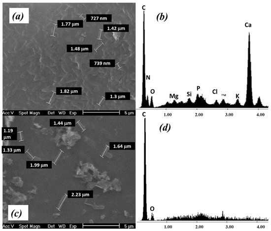 SEM and EDS analysis of P. koreensis/alginate beads system after Cr adsorption at (a,b) 0 h and (c,d) 48 h.