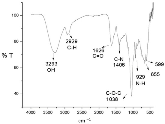 The FTIR spectrum before the adsorption (Figure 4) exhibits several bands corresponding to the characteristic functional groups of the bacteria biochemical compounds, specifically peptidoglycans, proteins, and lipopolysaccharides [40]. The signal centered at 3293 cm−1 is associated with the vibration of hydroxyl and amino groups (O-H and N-H stretching) corresponding to peptidoglycans [41]. Likewise, a characteristic band of C-H is detected at 2929 cm−1; the signal of the carboxylic group C=O is observed around 1626 cm−1, and the symmetrical stretching of C-O-C at 1038 cm−1. Finally, the functional groups of nitrogen of the amino groups can be observed at 1425 cm−1, which corresponds to the C-N bond, as well as the vibration outside the plane of the group N-H at 929 cm−1 [42]. The FTIR spectrum seems like the one obtained for Arthrobacter viscosus [41] and for Pseudomonas species such as P. alcaliphila [37] and for P. stutzeri [43].