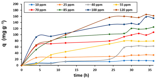 Here, it is important to mention that in preliminary assays it was observed that the pristine alginate beads have a considerable contribution in the chromium removal (about 20%); however, the P. koreensis presence in the support increased the removal until it reached nearly 100% in a synergic process. Then, considering the results of the tests for optimization (Section 3.3), a new experimental stage was implemented: a series of adsorption kinetic assays were performed to identify interactions in the adsorbent/adsorbate system. The operating conditions considered were: pH 6.6, stirring 100 rpm, temperature 30 °C, initial concentrations of Cr(VI) of 0, 10, 25, 40, 55, 70, 85, 100, and 120 ppm, amount of adsorbent (bacteria dry weight) remained constant as 0.36 g L−1, and reaction volume (Cr(VI) solution) was 100 mL. The experiments were performed by duplicate, and samples for monitoring were taken at 0, 4, 8, 12, 24, 28, 30, 32, 34, and 36 h. The adsorption system behavior is shown in Figure 6.