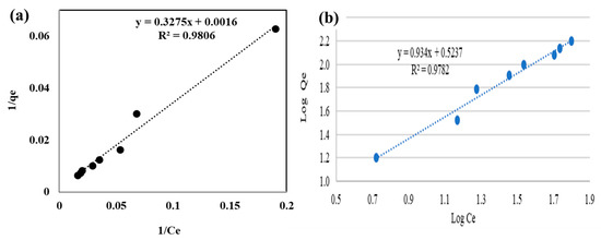 (a) Reciprocal linearization, and (b) logarithmic linearization of the Cr(VI) adsorption isotherm.