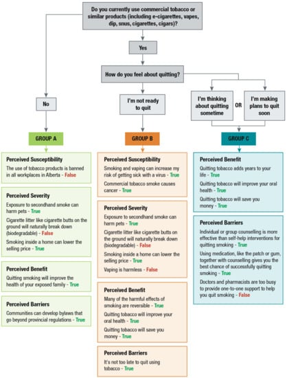 Jessiman-Perreault, G.; Dunn, R.; Erza, A.; Kratchmer, C.; Memon, A.; Thomson, H.; Allen Scott, L. Fact or Fiction? The Development and Evaluation of a Tobacco Virtual Health Tool. Int. J. Environ. Res. Public Health 2023, 20, 1397. https://doi.org/10.3390/ijerph20021397