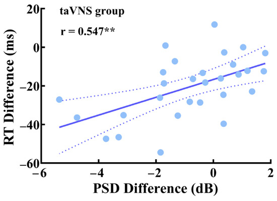 Partial correlation between the RT difference and the PSD difference of high-α oscillations in the taVNS group under the close-eye resting state. ** p < 0.01.