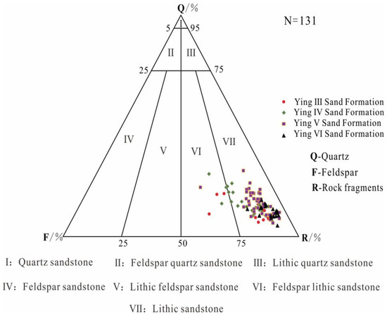 According to the identification results of 131 cast thin sections, the skeletal particle types of the tight sandstone reservoir in the study area include quartz, feldspar, and rock fragments, with average contents of 14.2%, 14.9%, and 69.5%, respectively, and the rock type is mainly lithic sandstone, followed by feldspar lithic sandstone (Figure 5).