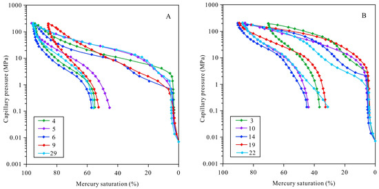 (A) HPMI curve of samples with Pore-lining chlorite. (B) HPMI curve of samples without Pore-lining chlorite.